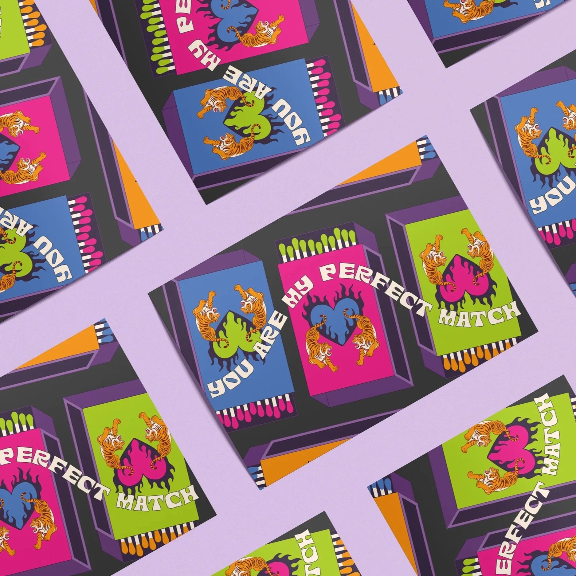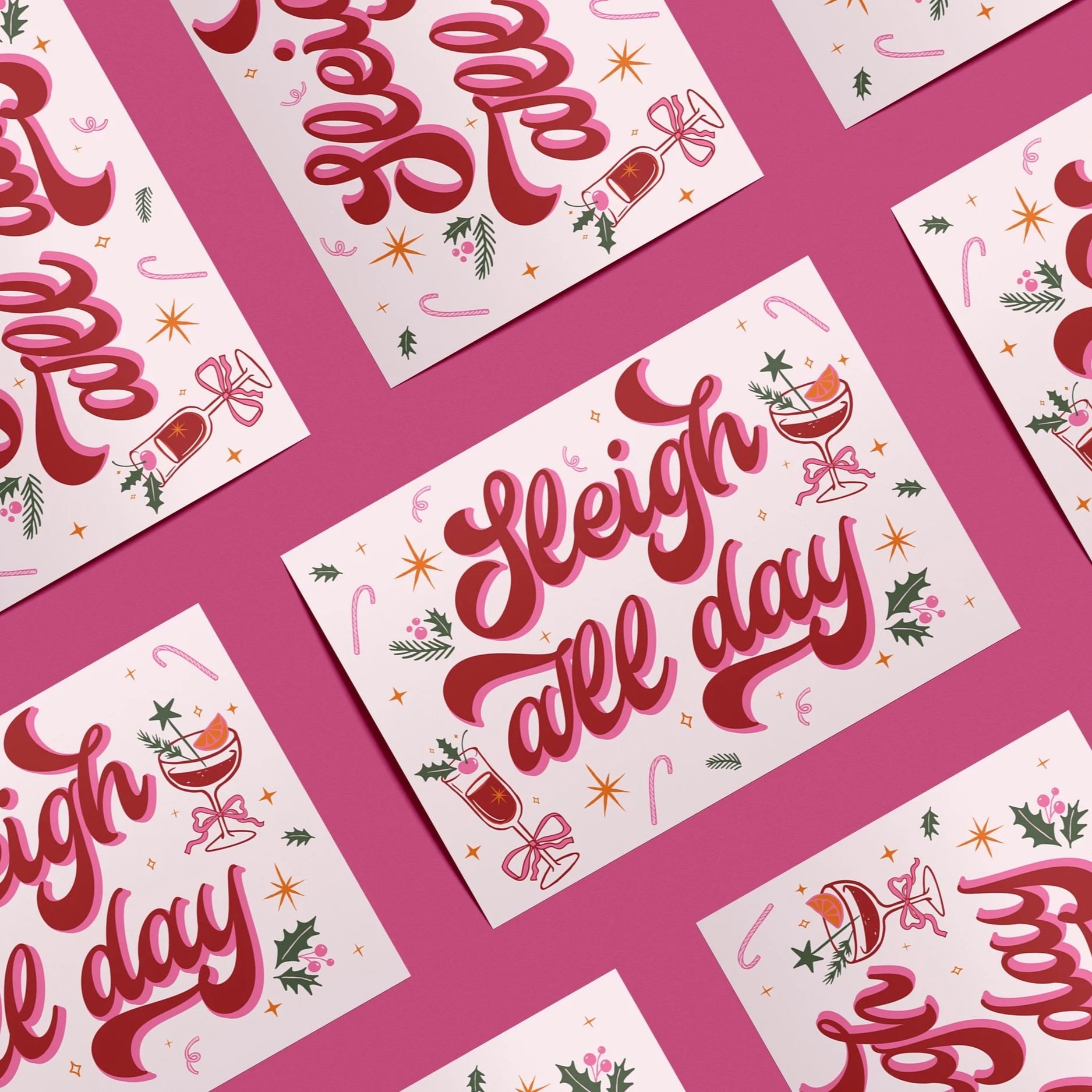 Alongside the free postcards, your extra little treat today is getting to know Sarah (she/her). She is the absolute OG in alternative, rock and roll, retro and colourful wedding stationery, and is a real inspiration to me as a designer. I love creative collaborations in general, but working alongside Sarah is particularly special because although we occupy the same space, we both believe in supporting one another with our businesses. When we have problems with printing, need a soundboard or a shoulder to cry on, we have each other’s backs. There’s nothing more Christmassy than that!