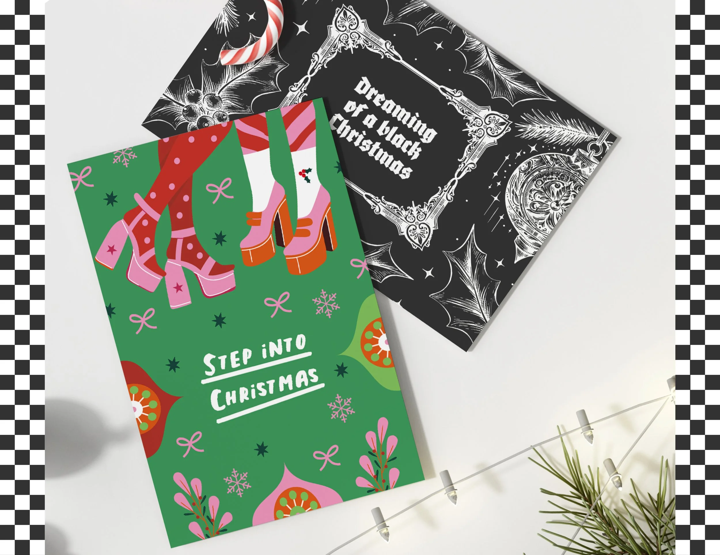 I know I’m not alone in loving both moody, dark aesthetics and bright hues and patterns, so I’ve designed two Christmas cards to cover those two sides.